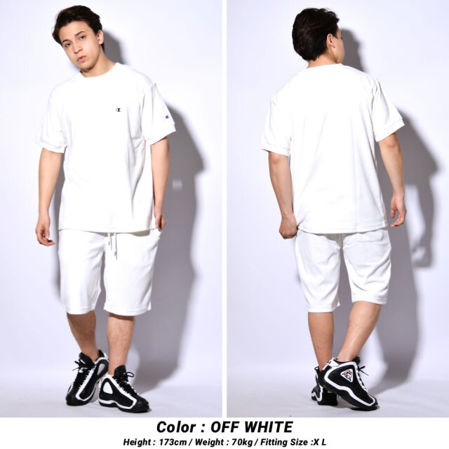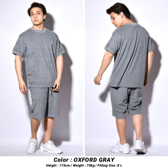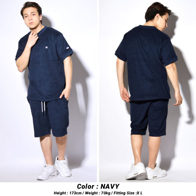 見た目にも涼感のある軽量で肌触りも柔らかい、ふわっとしたタオル地の様なパイル生地を使った、暑い夏にもピッタリなリラックス感溢れるパイルTシャツとパイルショーツの上下セット。 ふわっと柔らかな素材感を活かした夏らしい爽やかなシンプルデザインと優しく快適な着心地で、タウンユースは勿論、ルームウェアやパジャマとしてお家でのリラックスタイムにも最適。 セットアップでの着用は勿論、春夏コーデのベースアイテムとして他のアイテムと合わせた着こなしもオススメな、1セット持っておくだけでスタイリングの幅が広がること間違いなしのセットアップ。 ご自身用は勿論、ご家族やカップルでのペアルックやお揃いコーデにもオススメな、男女問わず愛用できるプレゼントにもピッタリなアイテムです。 ブランド : Champion (チャンピオン) 素材 : CVCテリークロス (綿80% ポリエステル20%) サイズ : M , L , XL(2L) 着用モデル : (MEN)173cm 70kg XLサイズ