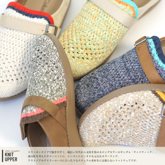 ニットをスエードを組み合わせた高級感のある素材使いにサンダルとスニーカーの中間ぐらいのオシャレで楽に履ける形状で幅広い年代から支持を集めるロングセラーのスライドサンダル「チャドウィック」 脚に馴染みやすく通気性の高い手編みのサマーニット素材のアッパー。 緩めにもしっかりめにもホールド感を調整できる甲高・幅広の人でも履きやすいアッパーベルト。 足を包み込むカップ状のかかと部分が安定感のある歩行をサポート。 クッション性と軽量性を両立した長時間の歩行も快適なテックライトソール。 水辺などアウトドアシーンでも安心な安定性・グリップ力に優れたアウトソール。 「ちょっとしたお出掛けにも」と言うコンセプト通り、季節感のあるカラーニット素材やチャンキーな厚底感で足元をオシャレに飾ってくれる、普段使いやタウンユースでも映える1足です。