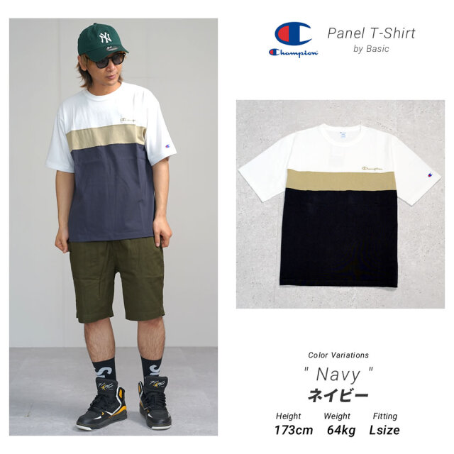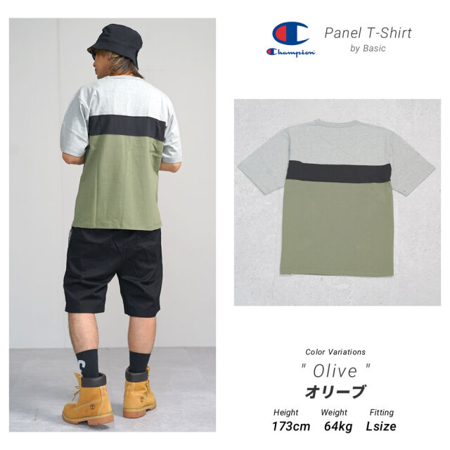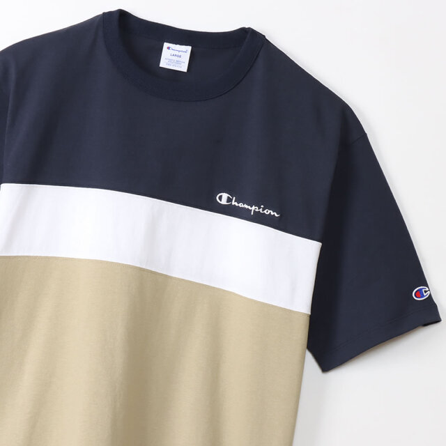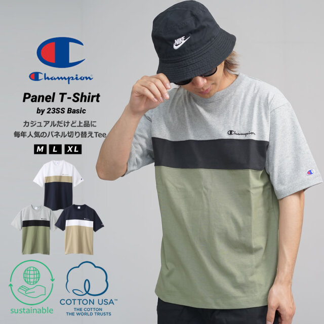 【一枚でもオシャレを演出できるパネル切り替えTシャツ】 落ち着いた色を使ったパネル切り替えデザインに仕上げた、一枚でもコーディネートが映える遊び心のある大人カジュアルな雰囲気のTシャツ。 地球環境に配慮して生産されたサスティナブルなアメリカ綿「コットンUSA」を100%使用した、ハリ・コシ感のあるしっかりとした天竺素材の表情も洒落てます。 オーセンティックなアメリカンアスレッチクウェアを思わせるバインダーネック仕様で、首回りのシルエットの良さとタフさも魅力的。 左胸のChampionのネーム刺繍、左袖のCロゴのミニパッチのアクセントもコーディネートをグッと引き締めてくれます。 夏らしいショーツスタイルから、トレンドのワイドパンツやカーゴパンツとザックリ合わせるだけでもサマになる、着回し力抜群で夏コーデの頼れる一着になってくれます。