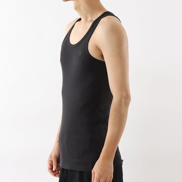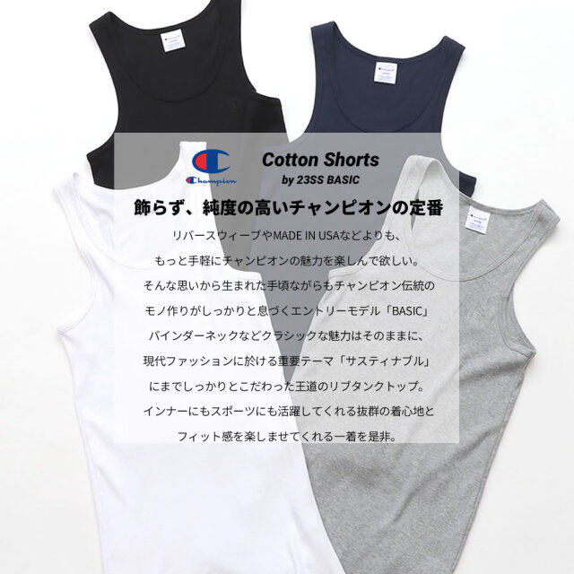 【シンプルでクラシックな王道リブタンクトップ】 左胸に生地と同色の糸でCロゴを刺繍した、シンプルながらも主張力のあるトナルカラーデザインのタンクトップ。 地球環境に配慮して生産されたサスティナブルなアメリカ綿「コットンUSA」を60%、同じく地球環境に配慮されたリサイクルポリエステル40%を使用した、伸縮性に優れたリブ編み生地を採用。 自然と馴染む心地良い肌触りと、高いストレッチによる快適なフィット感による快適な着心地で、デイリーからスポーツまであらゆるシーンで活躍してくれるユーティリティアイテム。 オーセンティックなアメリカンアスレッチクウェアを思わせるバインダーネック仕様で、首回りのシルエットの良さとタフさも魅力的なチャンピオンらしい一着に仕上がっています。