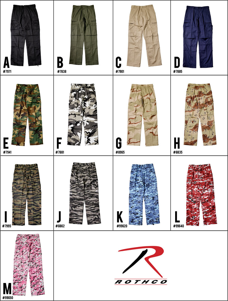 ファッションアイテムとして浸透したミリタリーウェアの中でも特に根強い人気を誇る、通称「カーゴパンツ」や「6ポケットパンツ」などの愛称で知られるROTHCOの『BDUパンツ』。 「BDU」=「Battke Dress Uniform (バトル・ドレス・ユニフォーム)」の名の通りアメリカ軍が採用していたミルスペックパンツを現代へと再構築した名作アイテム。 綿/ポリエステル混紡の軽量で丈夫な生地。動きやすいワイドシルエット。ツール収納に便利な大振りなフラップポケットやシンチバック、裾絞り用の紐と、軍パンならではの実用的な機能性も頼もしい。 タウンユースは勿論、アウトドアユースでも大活躍してくれる、ミリタリーファンならずとも押さえておきたい王道ミリタリーパンツです。 ユニセックスな人気を誇るパートナーや友達とのペアルックやリンクコーデにもオススメの一本。 ■SPEC ブランド:ROTHCO(ロスコ) モデル名:Tactical BDU Pants Basic 素材:コットン55% ポリエステル45% ■SIZE(ウエスト│股下│わたり│裾幅)単位:cm [XS] 66│80│29│18 [S] 78│80│31│19 [M] 86│80│33│21 [L] 98│80│36│21 [XL] 110│80│37│21