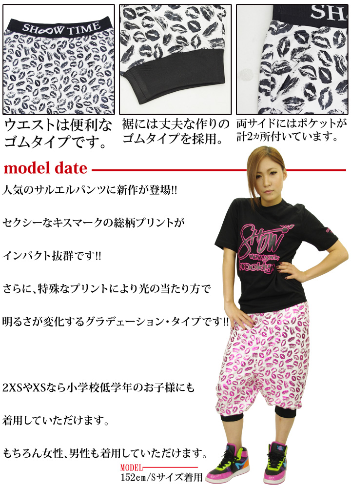 ストリートルックなデザインと「動きやすさ」を追求したアイテム展開で人気のストリートダンスウェアブランドSHOOWTIME(ショータイム)のダンスパンツ! リラックス感抜群なゆったりとしたバルーンシルエットが特徴的なサルエルショートパンツ!軽やかでストレッチ性に優れたスウェット生地は動きやすく快適な着心地。 セクシーなキスマークの総柄がインパクト抜群な、タウンユースでも映えるストリートルックなオシャレな見た目も魅力! サイズ:ウエスト│股下│わたり│裾幅(cm) 2XS:64~│30│30│12 XL:84~│35│35│17 男性モデル:178cm 70kg Lサイズ着用 女性モデル:152cm 2XS~XSサイズ着用 備考:ハーフパンツ ショートパンツ ショーパン ショーツ スウェットパンツ バルーンパンツ シェフパンツ サルエルパンツ ジャージ ワイドパンツ ユニセックス 男子 女子 男女兼用 メンズライク ストリート系 ダンス フィットネス スポーツ ヨガ ズンバ ランニング HIPHOP ヒップホップ ダンス 衣装 おしゃれ かっこいい かわいい カップル ペアルック お揃い 春 夏 秋 冬 オールシーズン 10代 20代 30代 40代