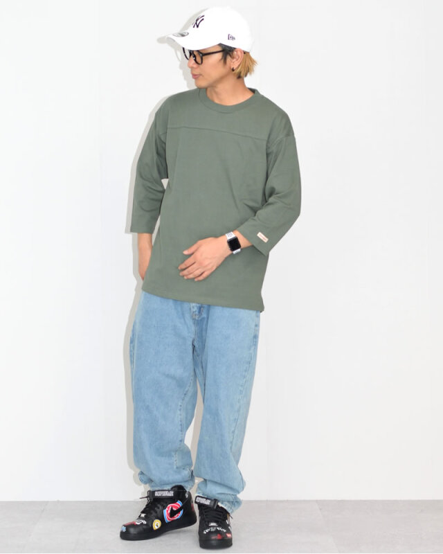 米国産のUSAコットンを使用したタフな7.0ozのヘビーウェイトコットン生地を使った切替7分袖フットボールTシャツ。