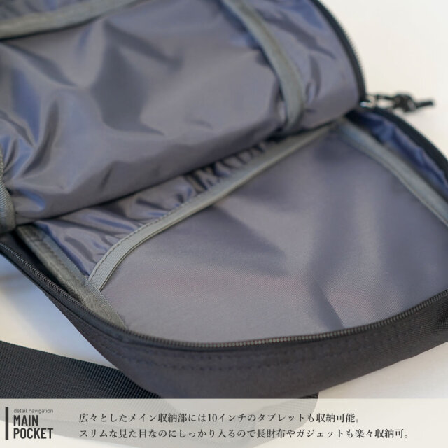 スマートフォンや財布などの必要最低限の荷物は勿論、デジタルカメラやスマートメディアなどのガジェットなども余裕を持って収納できる、スリムな見た目と裏腹に見た目以上の収納力を備えています。