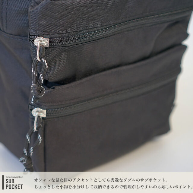 小分け収納に便利な立体感のある3つのフロントポケット。(最上部はダブルジップ仕様)