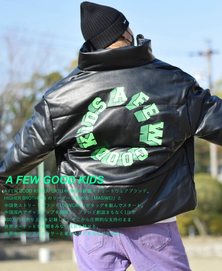 今世界中で話題沸騰中の、アジアNo.1 HIP-HOPグループ「88RISING(88↑)」に所属する「HIGHER BROTHERS(ハイヤー・ブラザーズ)」のリーダー「MaSiWei」と、中国発ストリートブランド「DONCARE(ドンケア)」とのコラボレーションブランド「AFGK(A FEW GOOD KIDS)」のレザーダウンジャケット。