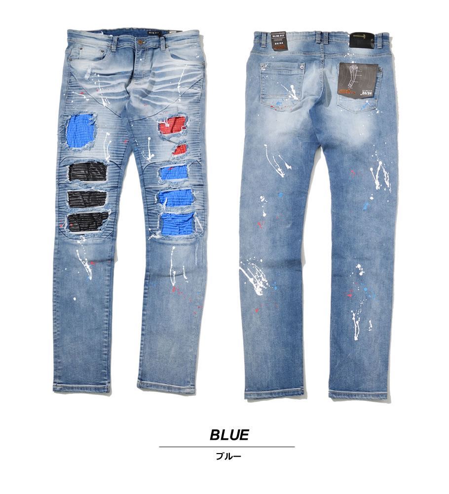 激しくクラッシュ加工を施したブルージーンズに、バイカーズパンツのディテールをクレイジーなカラーパターンで落とし込み、ペイントでさらにデザイニングを深めたインパクト抜群なデザイン。