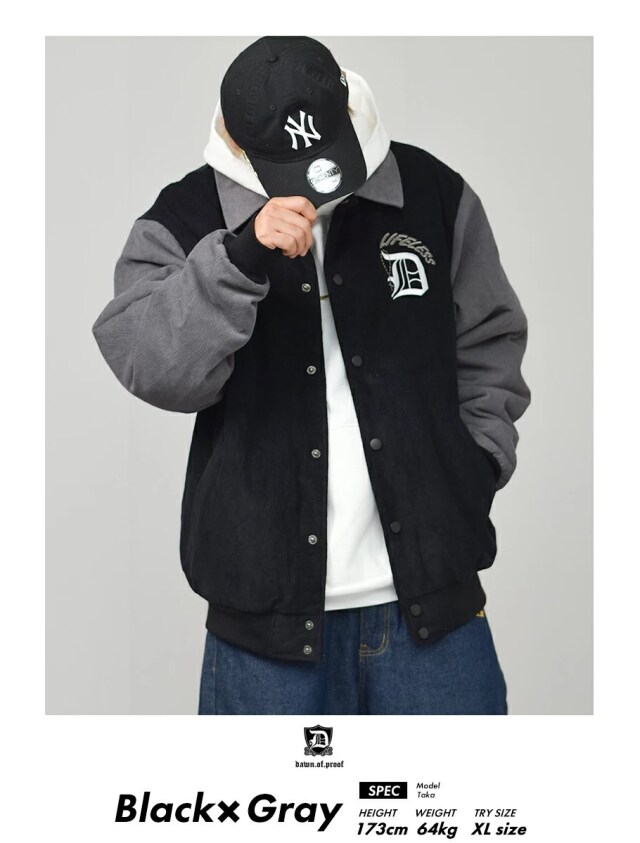 スタジャン レターマンジャケット メンズ レディース 中綿 コーデュロイ 切替 ロゴ刺繍 大きいサイズ B系 ストリート ブランド dpjt089