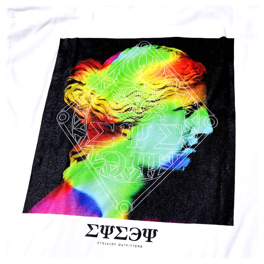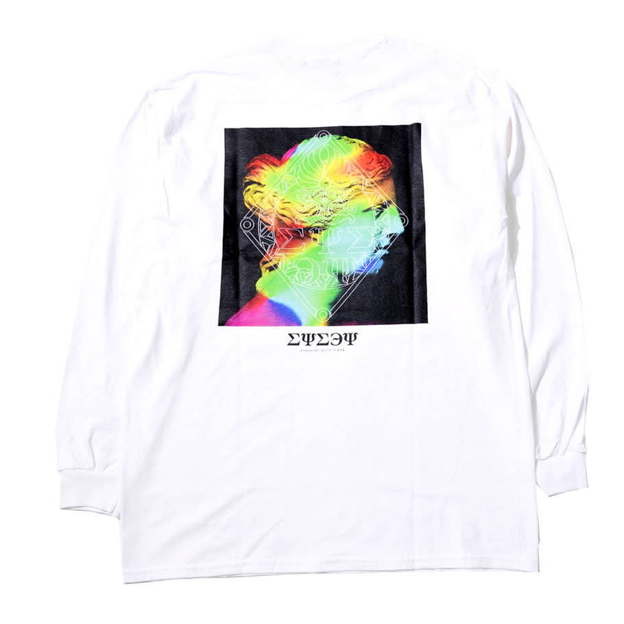 フロント側は左胸にギリシャ文字をフィーチャーしたスタイリッシュなブランドネームのワンポイントでシンプルに、バックプリントはアフロディーテ(通称:ミロのヴィーナス)の横顔をデジタルなサーモカラーグラフィックを大胆に落とし込んだインパクト抜群な仕上がりとなっています。