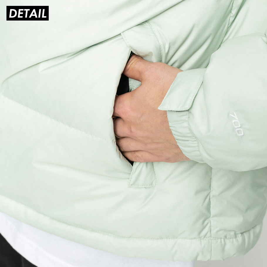 フロントバックに入ったハーフドームロゴ刺繍、左袖に入った700FPを示す「700」の刺繍、オーバーサイズなボリューム感のあるシルエットなど、USAモデルならではのデザイン性も魅力です。