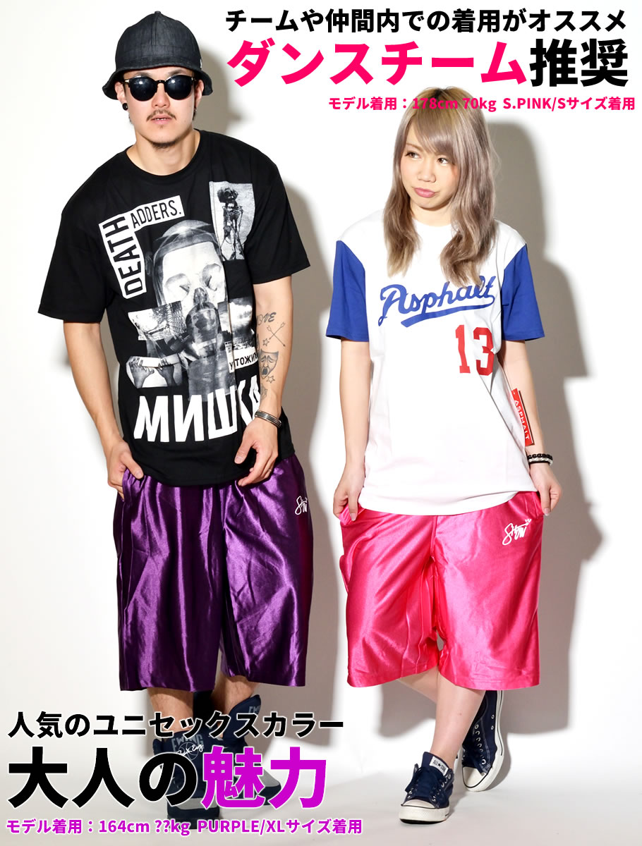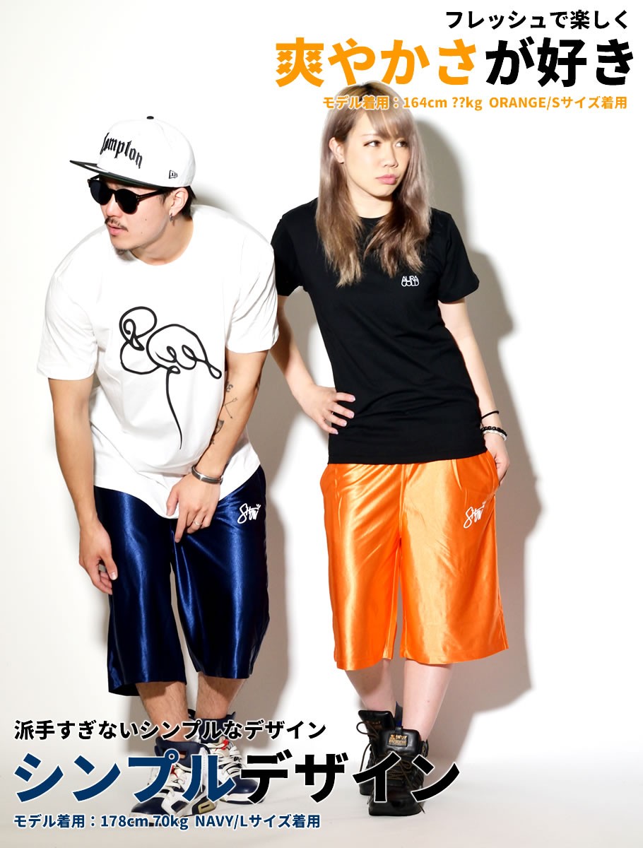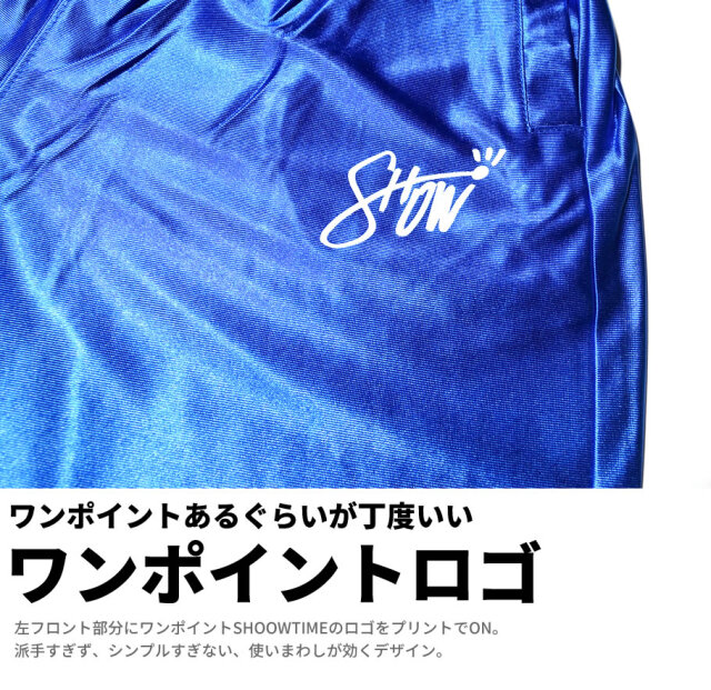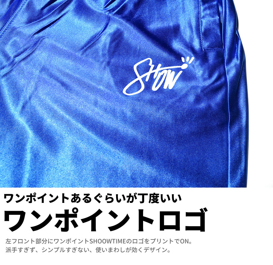 ストリートルックなデザインと「動きやすさ」を追求したアイテム展開で人気のストリートダンスウェアブランドSHOOWTIME(ショータイム)のダンスパンツ! シャイニーな光沢感のあるメタリックカラーのサテンジャージ生地を使った、スポーティなミックスコーデにも欠かせないバスケットショーツ。 ブランドロゴをワンポイントに入れたタウンユースでも映えるストリートルックなオシャレな見た目も魅力的!