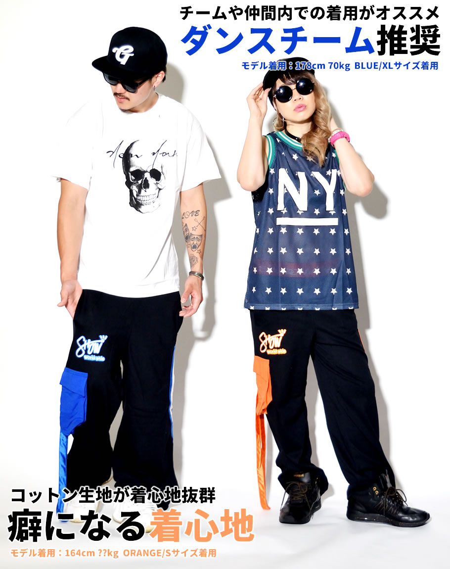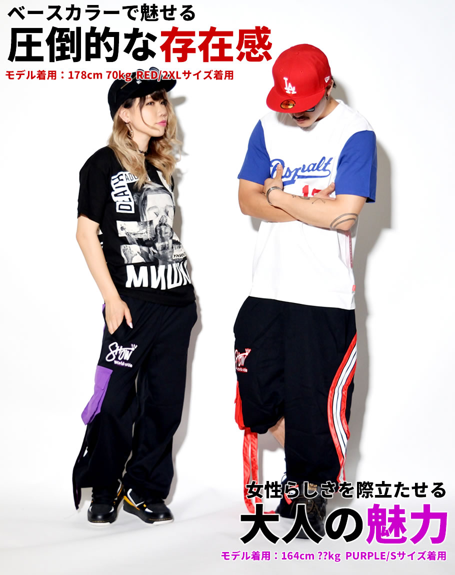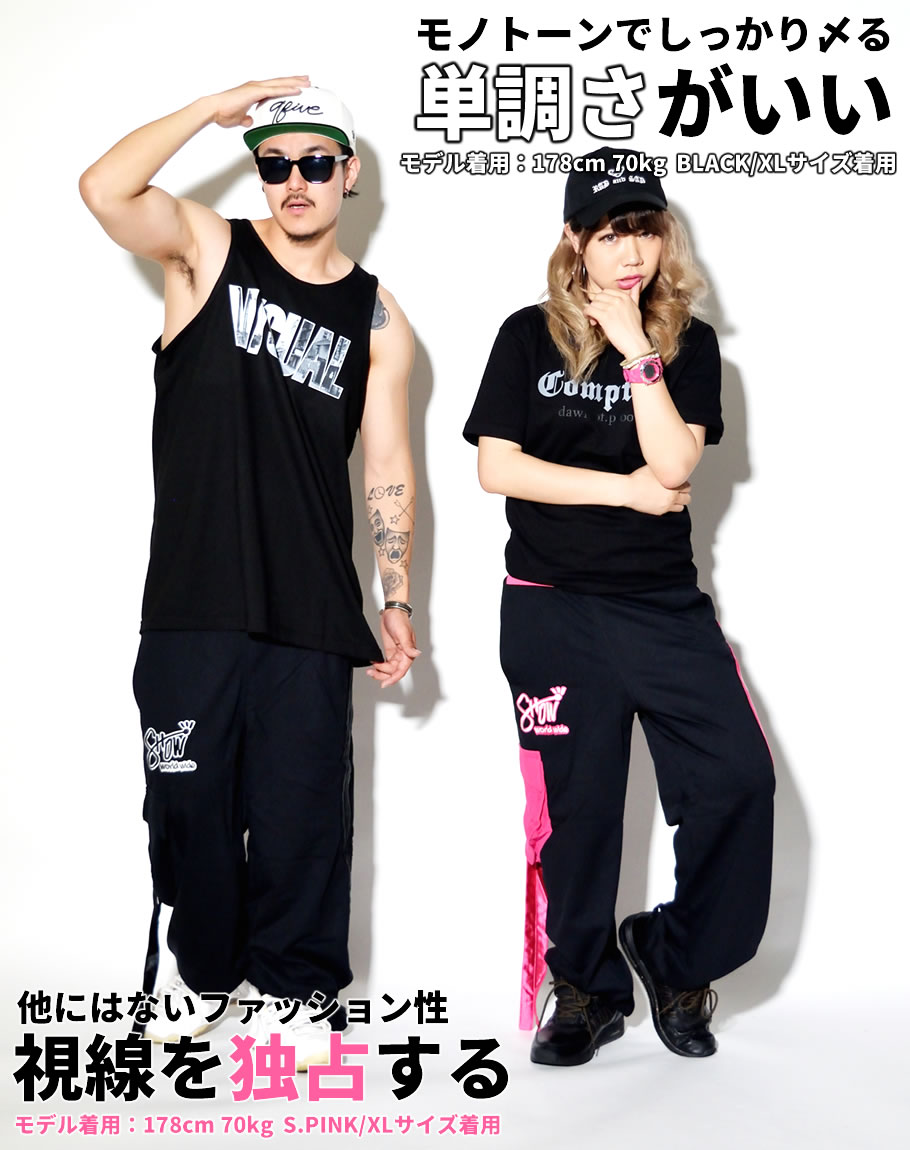 ストリートルックなデザインと「動きやすさ」を追求したアイテム展開で人気のストリートダンスウェアブランドSHOOWTIME(ショータイム)のスウェットパンツ。 ゆったりとしたシルエットの6ポケットカーゴパンツスタイルに、「動き」を演出してくれる流線形のサテンサイドライン、ポップなロゴ刺繍、カラー生地で切り替えたポケットやロゴをジャガードデザインしたウエストバンド&サスペンダーがアクセントになった、タウンユースでも映えるストリートルックなオシャレな見た目も魅力的! 動きを邪魔しない程良い厚みで柔らかなコットンジャージ生地を使った快適な穿き心地でルームウェアやワンマイルウェアにも最適! ウエストと裾口は共にドローストリングコードでフィット感を調節可能です。