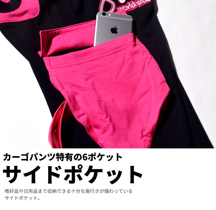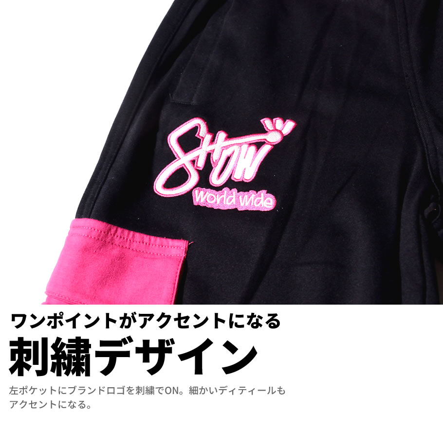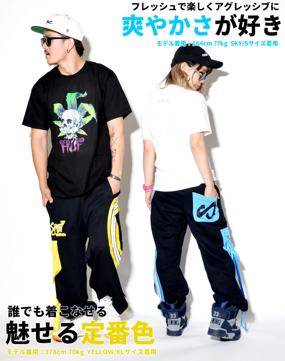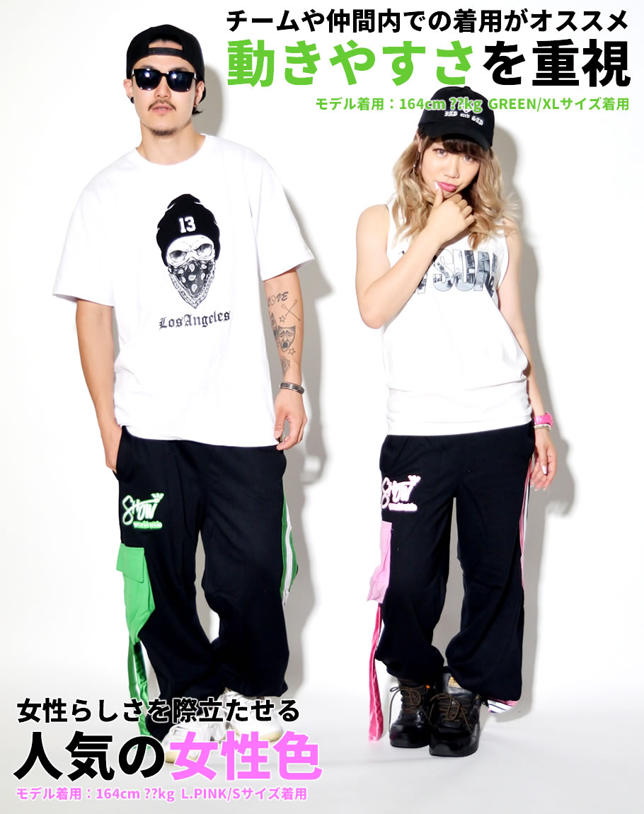 ストリートルックなデザインと「動きやすさ」を追求したアイテム展開で人気のストリートダンスウェアブランドSHOOWTIME(ショータイム)のスウェットパンツ。 ゆったりとしたシルエットの6ポケットカーゴパンツスタイルに、「動き」を演出してくれる流線形のサテンサイドライン、ポップなロゴ刺繍、カラー生地で切り替えたポケットやロゴをジャガードデザインしたウエストバンド&サスペンダーがアクセントになった、タウンユースでも映えるストリートルックなオシャレな見た目も魅力的! 動きを邪魔しない程良い厚みで柔らかなコットンジャージ生地を使った快適な穿き心地でルームウェアやワンマイルウェアにも最適! ウエストと裾口は共にドローストリングコードでフィット感を調節可能です。
