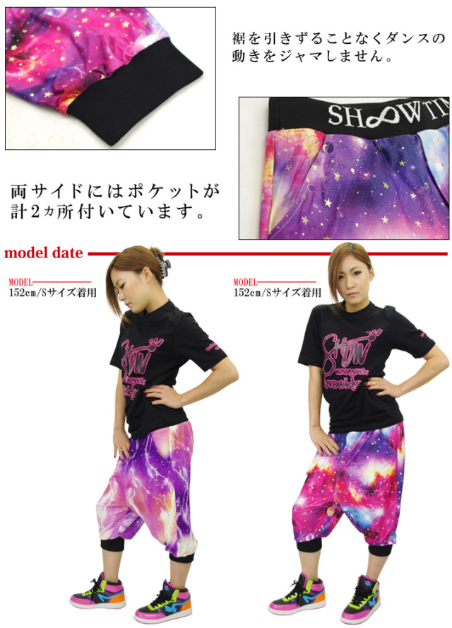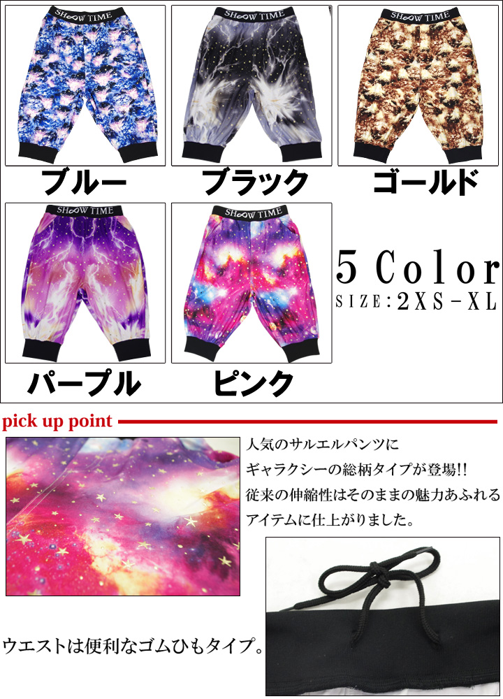 ストリートルックなデザインと「動きやすさ」を追求したアイテム展開で人気のストリートダンスウェアブランドSHOOWTIME(ショータイム)のダンスパンツ! リラックス感抜群なゆったりとしたバルーンシルエットが特徴的なサルエルショートパンツ!軽やかでストレッチ性に優れたスウェット生地は動きやすく快適な着心地。 宇宙をモチーフにしたギャラクシー柄がインパクト抜群な、タウンユースでも映えるストリートルックなオシャレな見た目も魅力的!