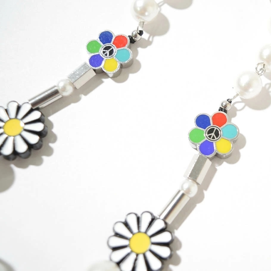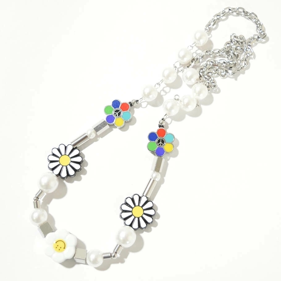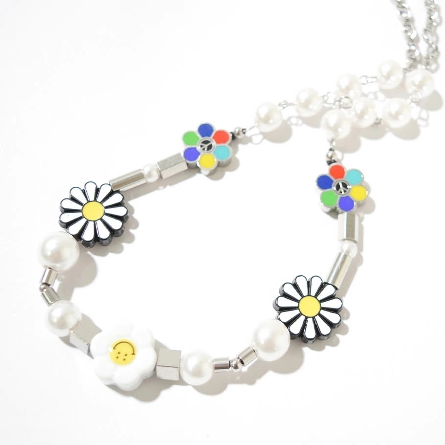 スマイルフラワーをはじめとしたオリジナルチャームを装飾した印象的なデザインのネックレス。